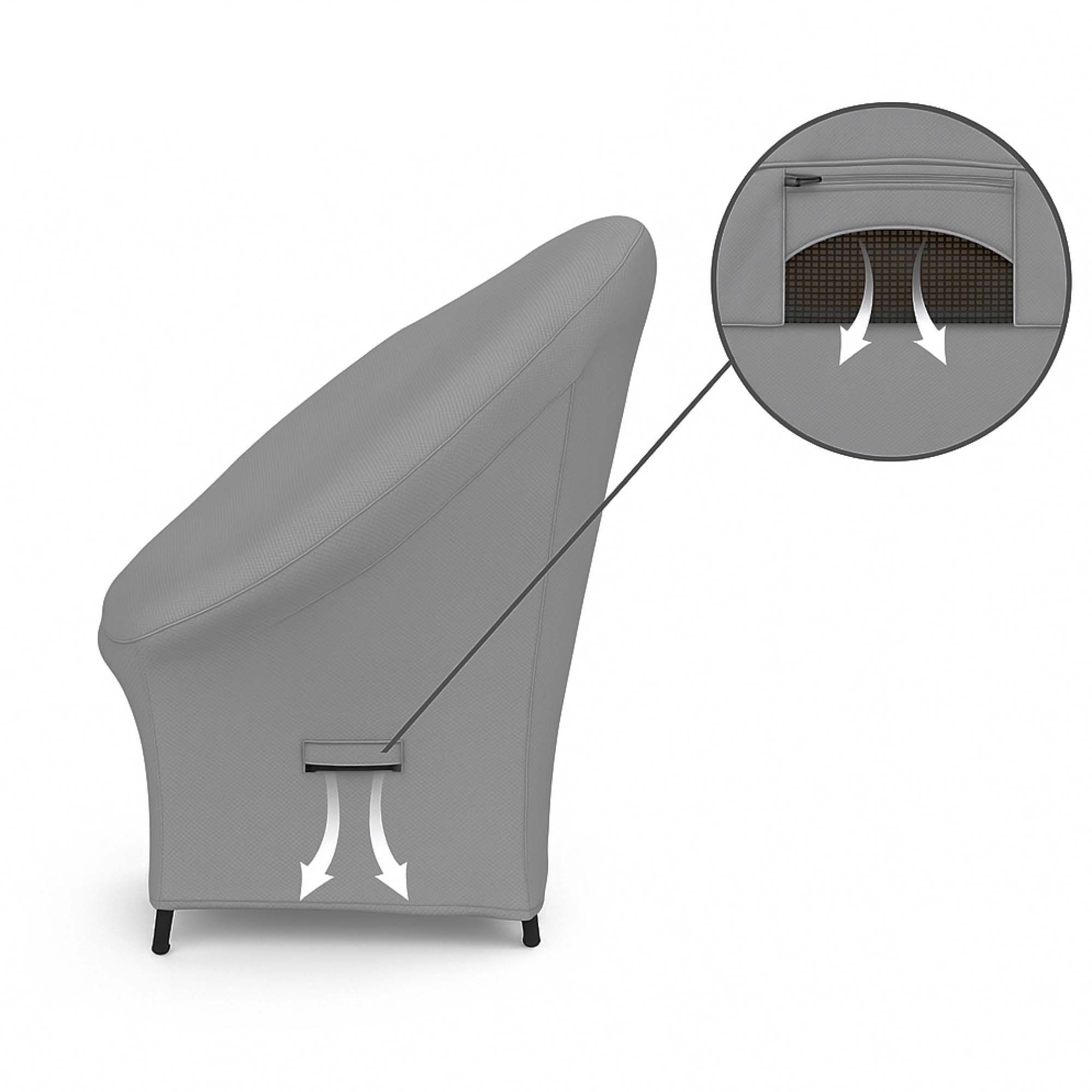 Our Acapulco chair covers are made from 18 oz PVC-coated polyester, engineered for long-term outdoor performance. The fabric is water-resistant to keep rain from seeping through, while the UV-protective coating prevents fading and weakening from prolonged sun exposure. Built-in air vents allow moisture and trapped air to escape, reducing mildew buildup. Reinforced seams add durability, especially around the chair’s rounded frame, while the adjustable drawstring hem secures the cover tightly in place during wind. Integrated handles make putting on, removing, and storing the cover hassle-free.