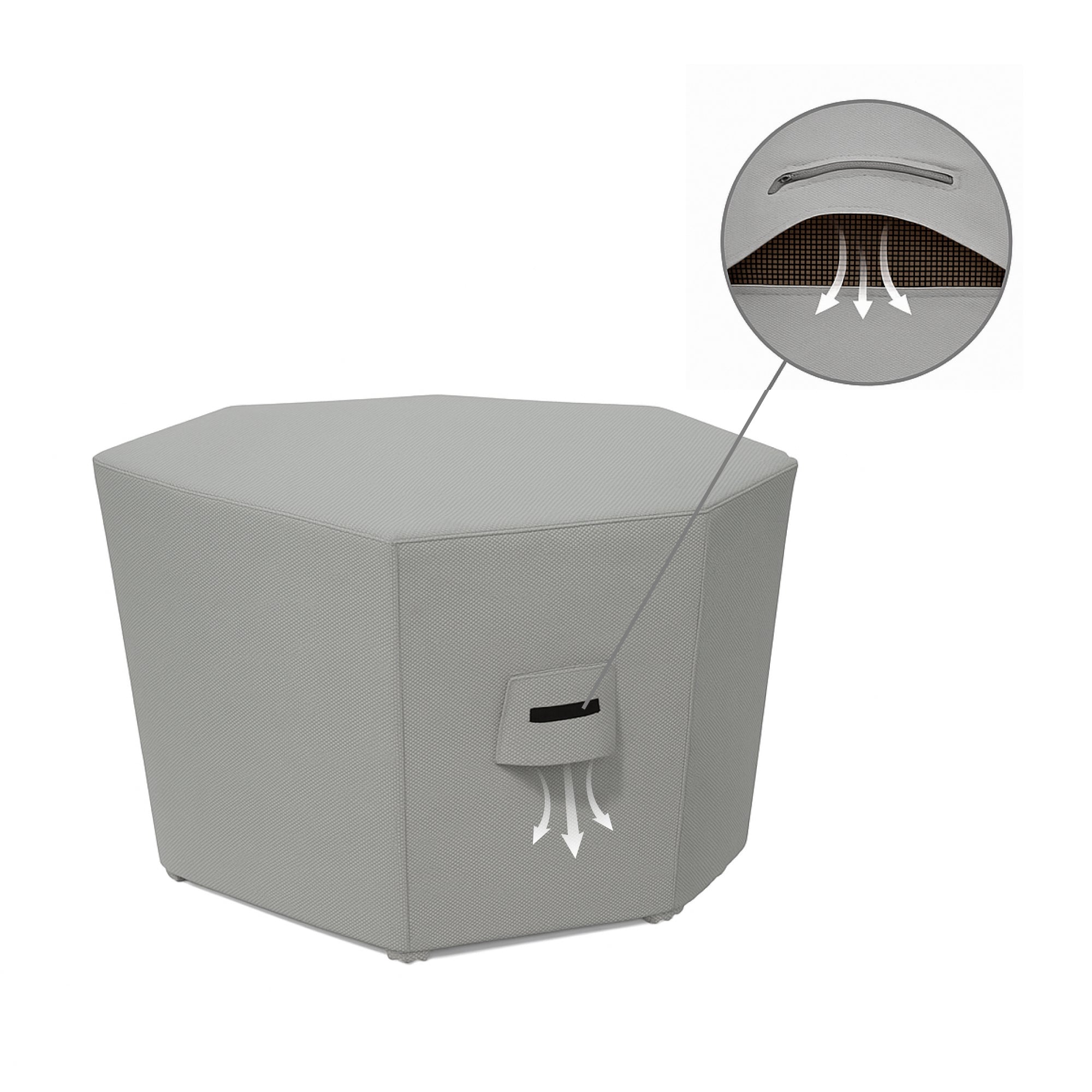 • Ventilated, Weatherproof Engineering: Strategic air vents maintain airflow beneath the cover, reducing humidity buildup without compromising waterproofing. The flat octagonal top and eight angled sides promote natural water runoff from multiple directions, preventing pooling, while the geometric design provides superior wind deflection.