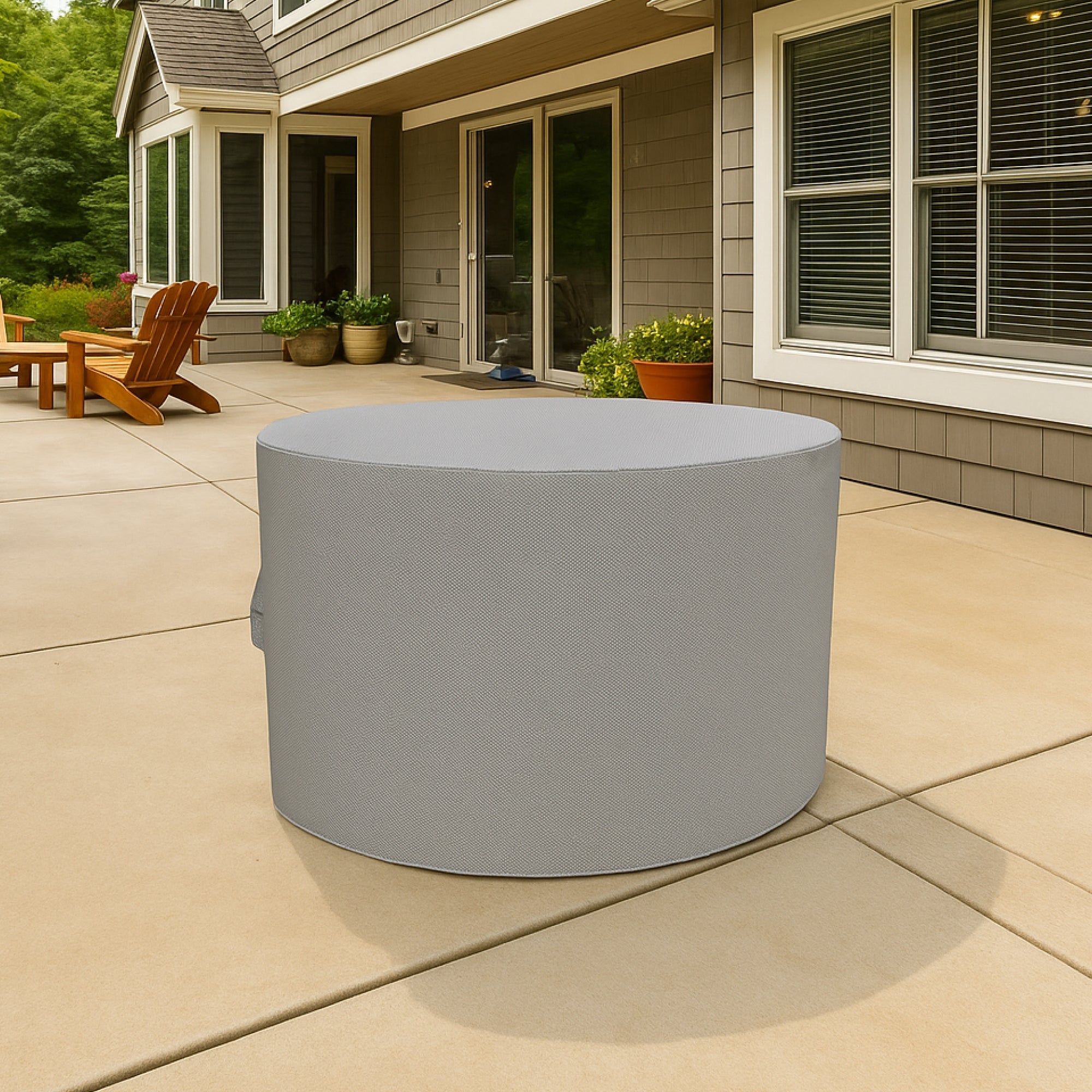This firepit cover fits securely and looks clean on the patio. Water never pools on top, and the drawstring keeps it tight even on windy nights. After months outside, there’s no fading or cracking. Couldn’t ask for more.
