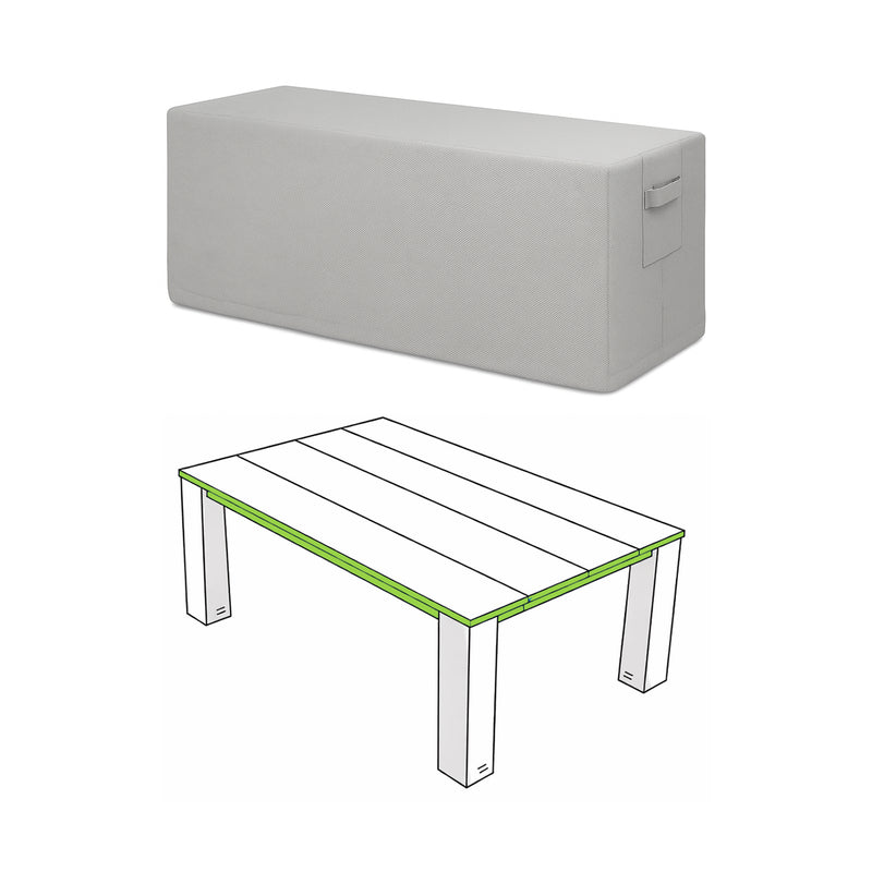 Our rectangular fitted table covers feature industry-grade material and construction. Designed with 18-ounce 1000 Denier PVC-coated Polyester, these covers provide all-weather protection. Smart construction features dual side handles for seamless handling. Breathable, ventilated design prevents mold and mildew growth. Easy-to-clean fabric makes cleaning a breeze. Waterproof and UV-resistant material ensures durability and is made to last for years.