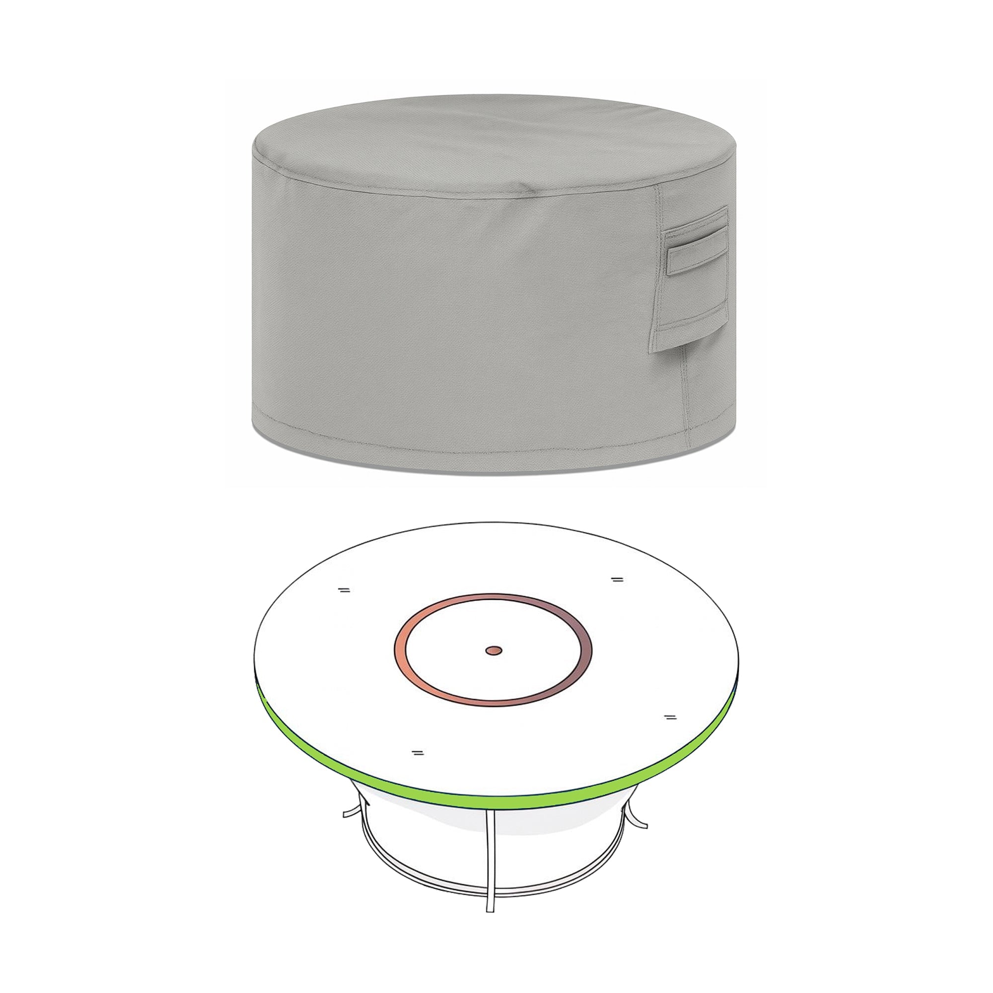 The Custom Round Fire Pit Cover - Style 4 uses 18 oz PVC-coated polyester, a premium material engineered for extreme outdoor durability. This commercial-grade fabric delivers Complete waterproofing that keeps rain, snow, and ice out, UV-resistant coating that prevents sun damage and color fading, Tear and puncture resistance for protection against branches and debris, and mildew and rot resistance for long-term use in humid climates.