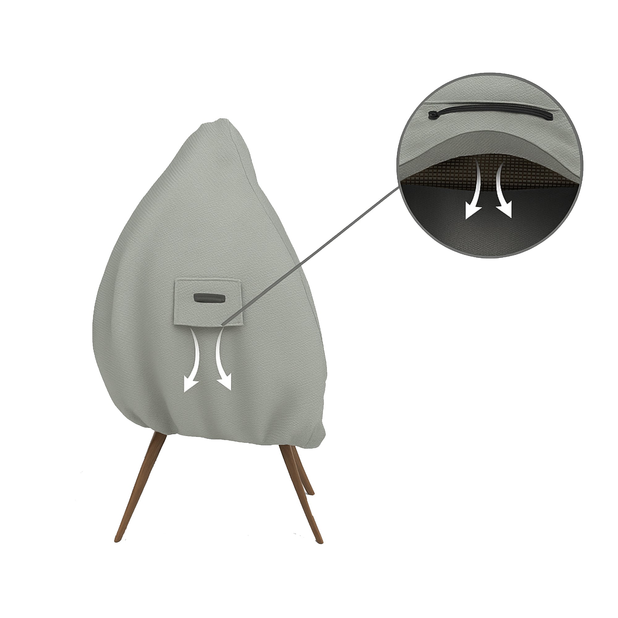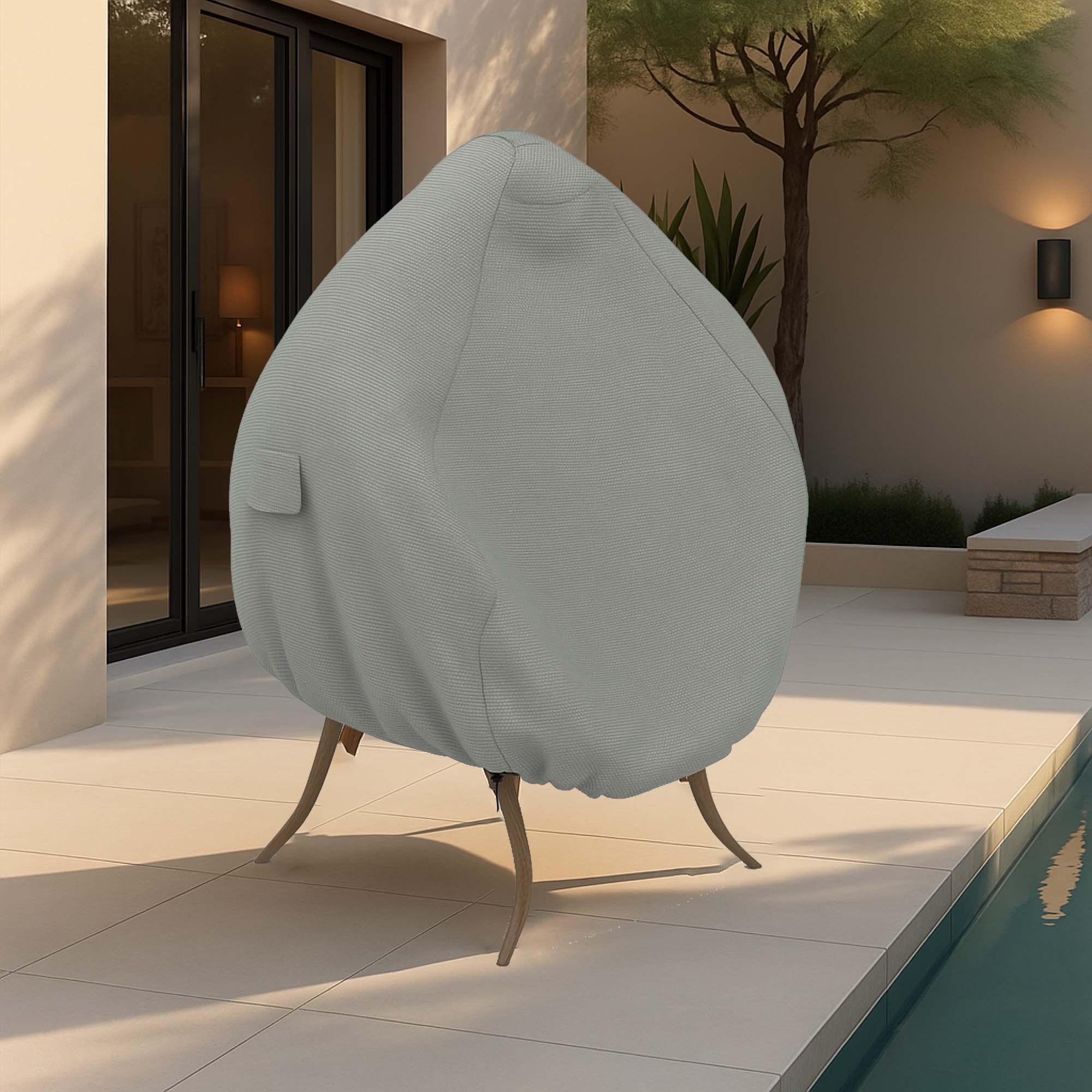 Our egg chair covers are made with 18 oz PVC-coated polyester, engineered for long-term outdoor use. The material resists water and blocks UV rays that cause wicker and cushions to fade or crack. Built-in air vents reduce condensation, keeping the interior dry and fresh. Reinforced seams prevent tearing around curves, while the adjustable drawstring hem holds the cover in place during strong winds. Convenient handles are stitched in for easy use, whether covering, removing, or storing.